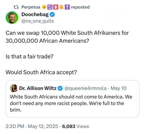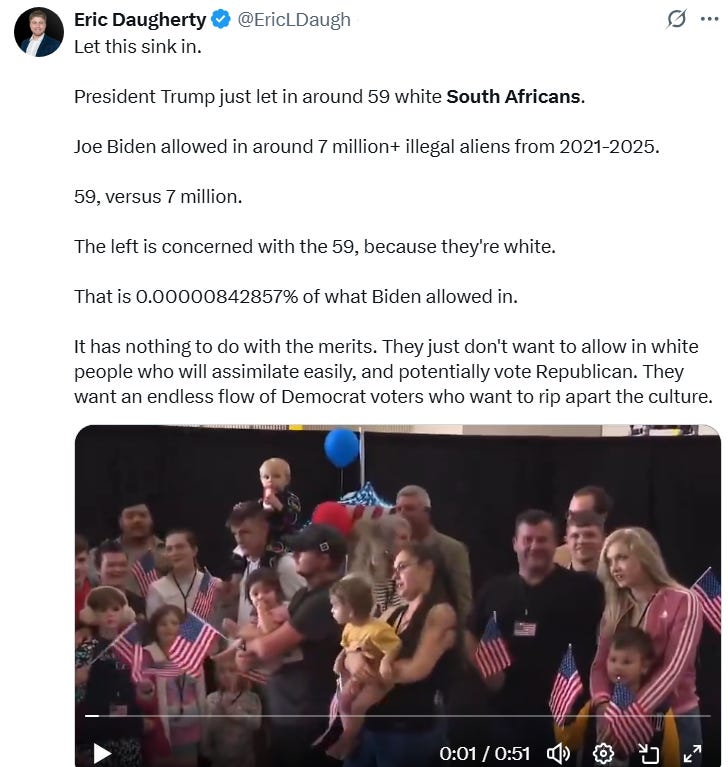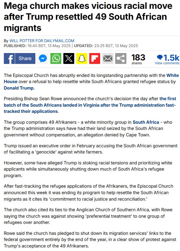 And nothing more could be more triggering to Democrats and fake churches like the Episcopal Church than helping a few dozen White people who are actually facing persecution: