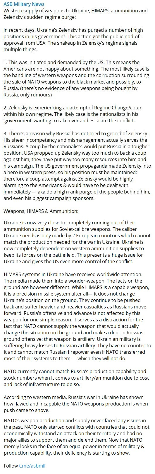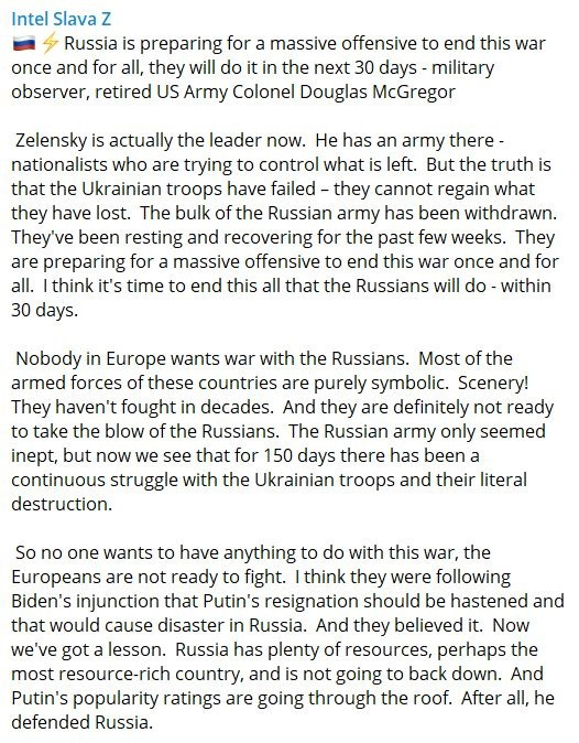 Some longer analysis of the current situation courtesy of the two best English language Telegram channels covering the war from the Russian point of view: