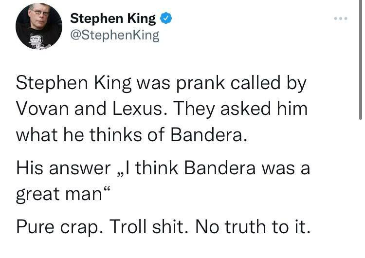 Darn Russian comedian trolls! [Stephen King Under Fire for Praising Leader of Ukrainian WWII Nazi Collaborators as a 'Great Man' and Stephen King addresses praise for Nazi collaborator]: