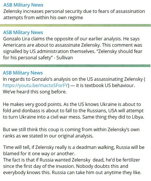 LIRA’S PREDICTION: The Russians need Zelensky ALIVE to negotiate and sign a credible peace treaty or ceasefire agreement BUT he is increasingly no longer useful to the Biden Regime-NATO - who plan on making him a martyr e.g. maybe via a convenient missile strike that also decapitates his regime (him and all the senior people) which the Russians will get blamed for. Then there will be no Ukrainian leader credible enough to negotiate peace with Putin and the country becomes the next Iraq-Afghanistan-Libya-Syria - for the Ukrainians AND the Russians (never mind how bad that will be for the average Ukrainian…)