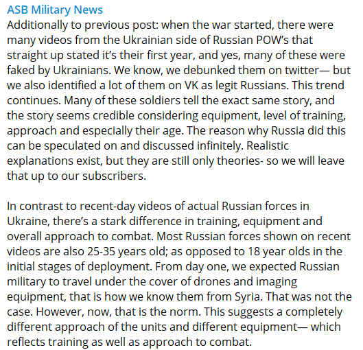 And it sounds like the Russians are learning from their initial mistakes or missteps - would you expect to ever hear the US govt or its media ever admit something like this? (Why its its interesting to follow the pro-Russian Telegram channels and they don’t try to pass off Arma 3 videos as their own combat footage!):