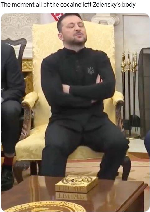 Former sex worker comedian Cocaine Fuhrer Zelensky really stepped in it when he met with Trump and JD Vance the other day: