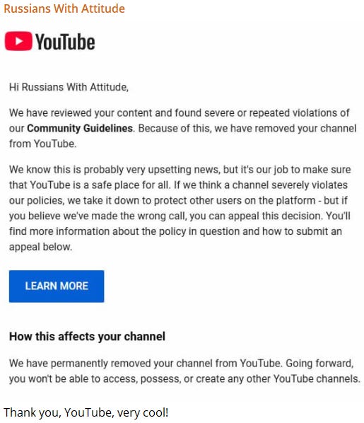 Note that the Russians With Attitude YouTube channel recently got nuked by the censors: