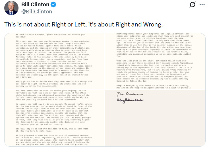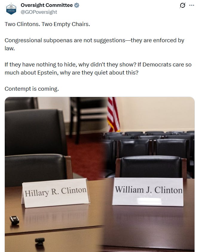 The useless faction of the Uniparty known as the GOP is preparing to send the Clintons strongly worded letters tweets over the refusal of the Clintons to respond to congressional subpoenas to testify about their pal Jeffrey Epstein: