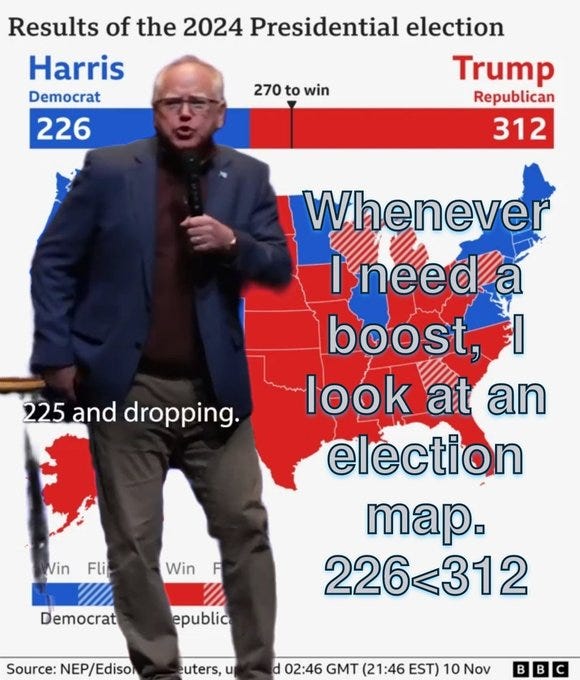 I knew it (he's Mr. Garrison from Southpark or that angry feminist!), feel the joy, when I need a boost (I look at an election map) and more tampon Tim Walz's masculinity intimidates MAGA memes!