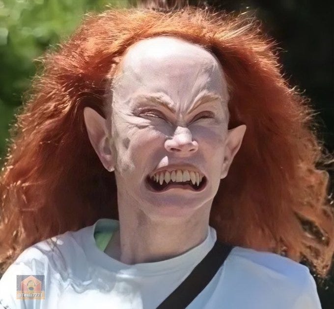 thank youl I finally got the name of the monster with the puppet trump head. Griffin. Turns out she has 1. aged a lot since, and 2. has the colour of a corpse. Is she alive? or turned into a zombie?