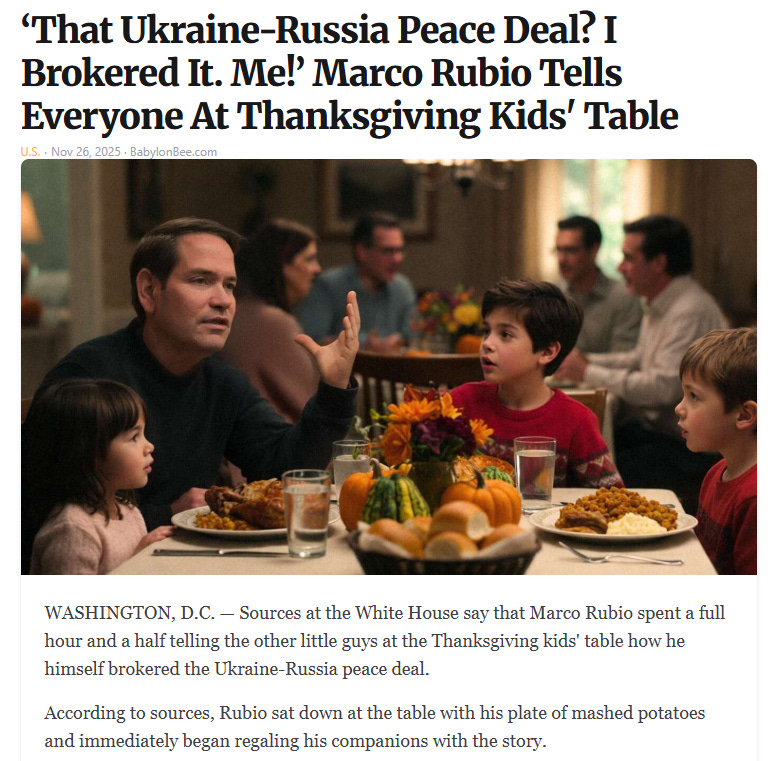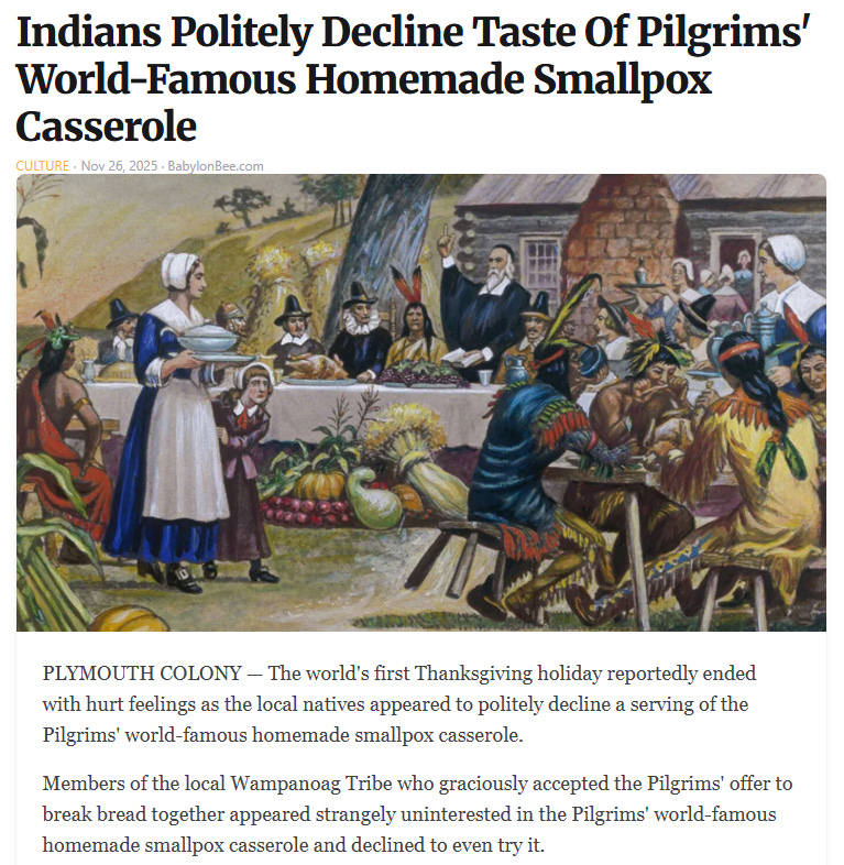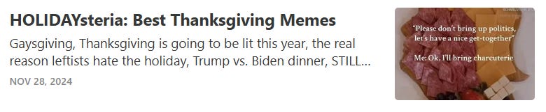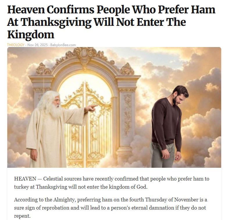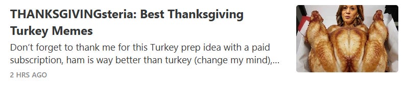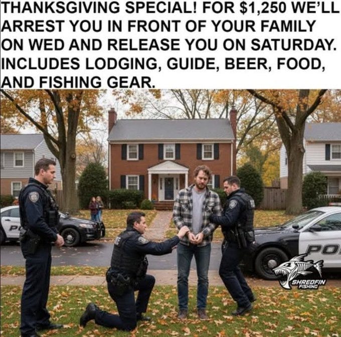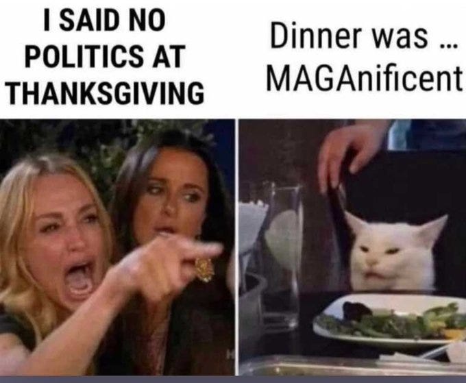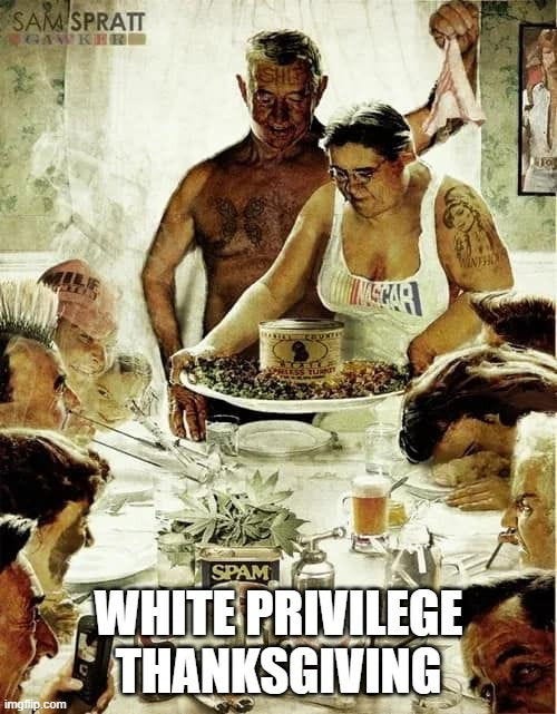 White privilege Thanksgiving, how to save on xmas gifts (bring up politics), beware of AI slop recipes, WKRP turkey drop + Rush Limbaugh's real Thanksgiving story and more Thanksgiving memes!