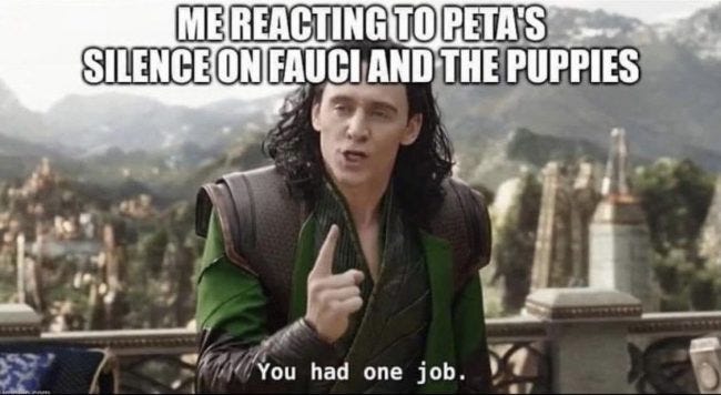 Me reacting to PETA’s silence on Fauci and the puppies…