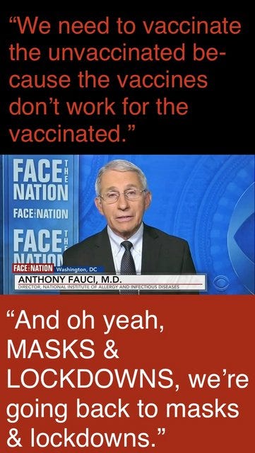 “We need to vaccinate the unvaccinated because the vaccines don’t work for the vaccinated… And oh yeah, MASKS & LOCKDOWNS, we’re going back to masks & lockdowns.”