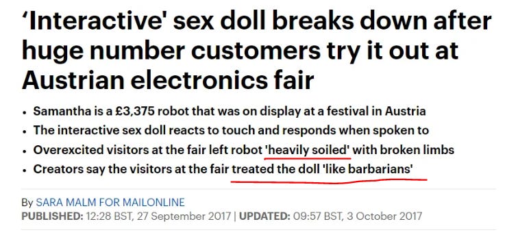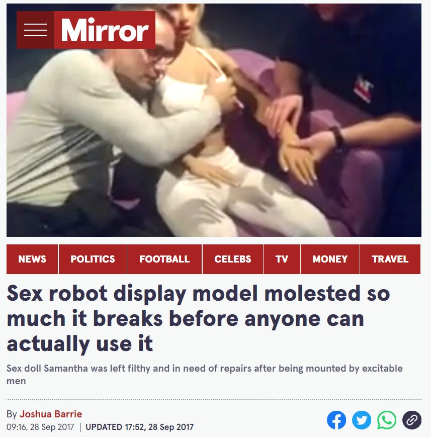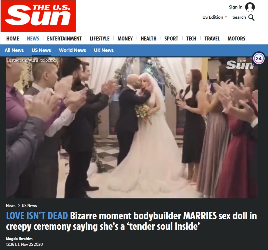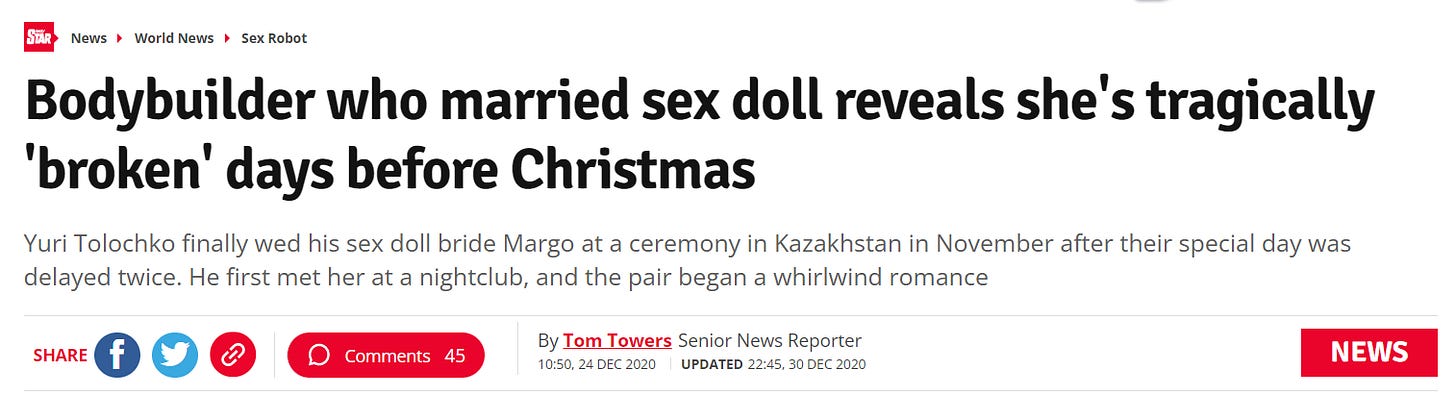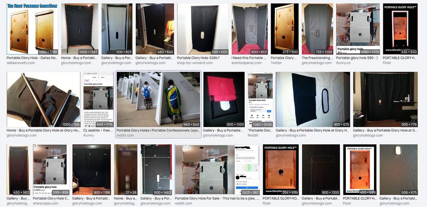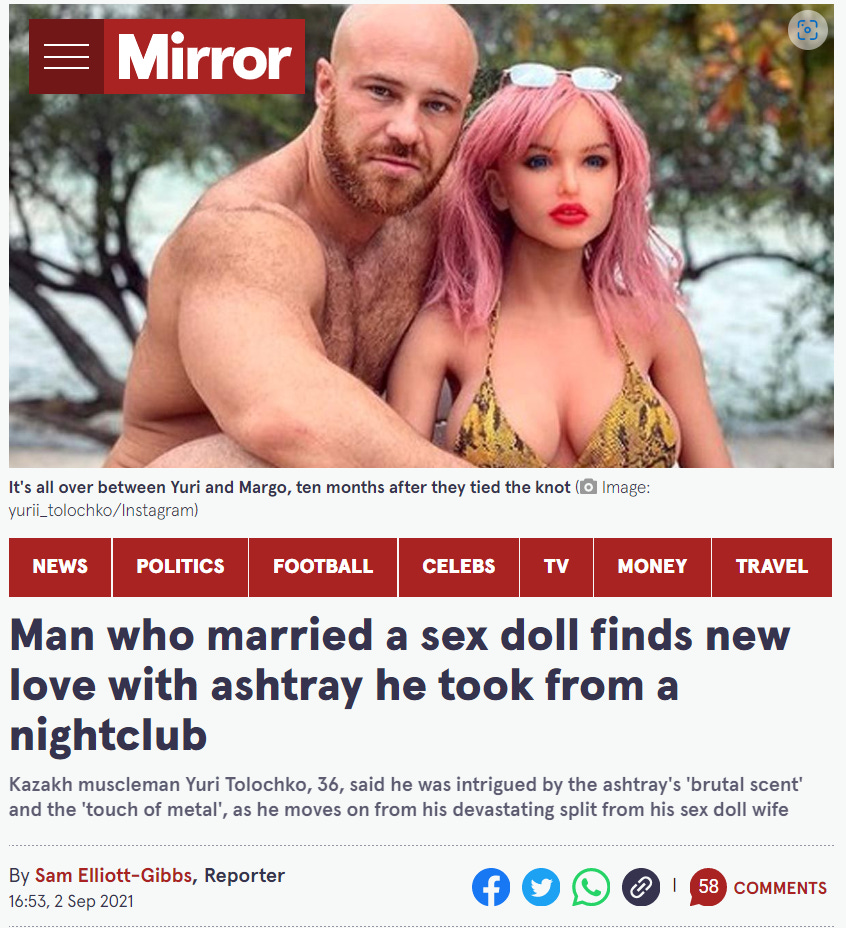 I have just had an unfortunate education. Glory holes, sex dolls, people who would marry a sex doll, people who destroy a sex doll by excessive touching.