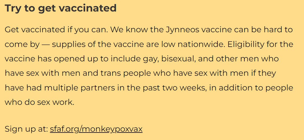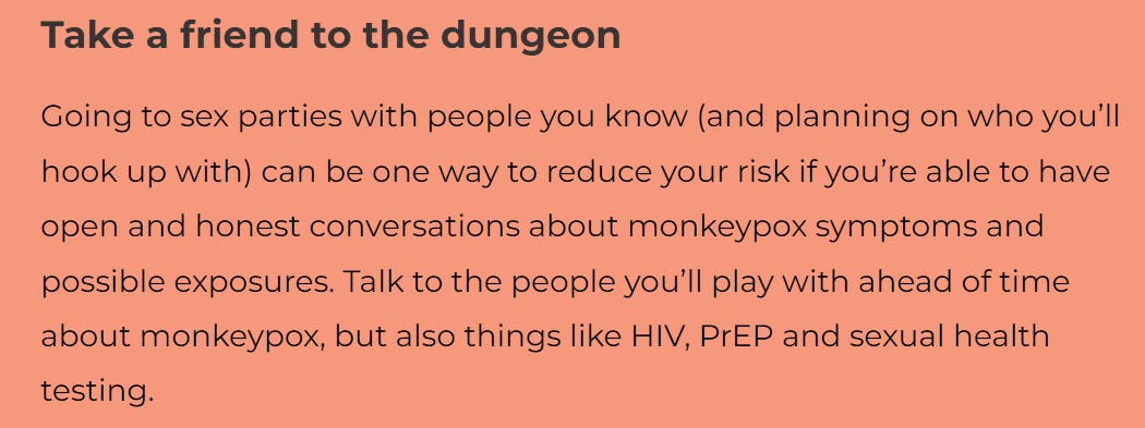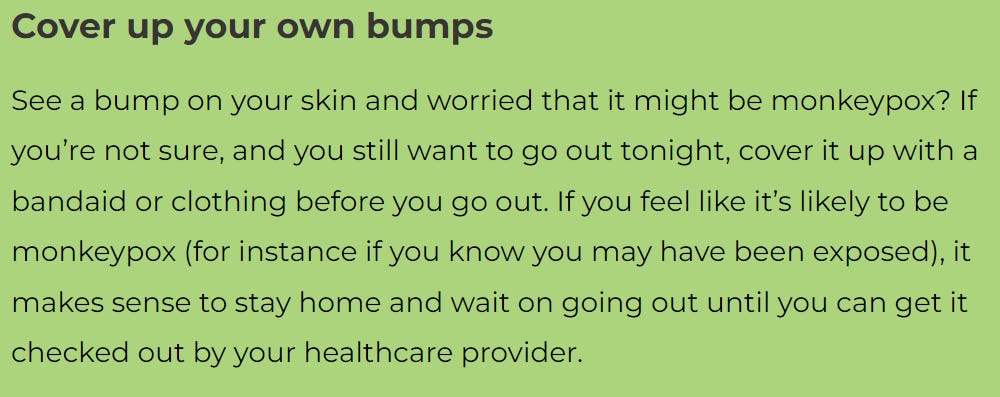 A recent San Francisco AIDS Foundation’s guide to attending Pride events and having gay sex during a Monkeypox outbreak came with helpful suggestions like “cover up your bumps:”