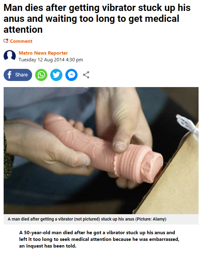 Many decades ago I was a candy striper in a large NYC hospital. A man came in to the ER is distress. He had a light bulb in his anus. The doctors were concerned to get it out without breaking the glass. I don't remember if I heard how they did it.