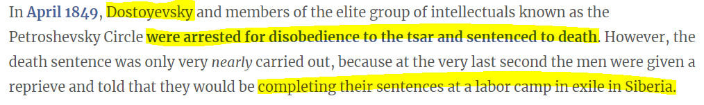 Whoops! Looks like Dostoevsky was also a Russian dissident sentenced to death by Russia’s Tsar at the time and then exiled to Siberia!