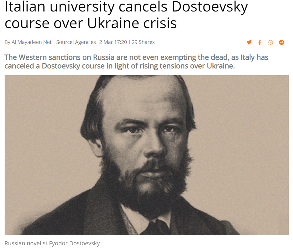 The same goes for Fyodor Dostoevsky, who, despite being one of the greatest novelists of all times, was still a Russian. So he also needs to be cancelled!