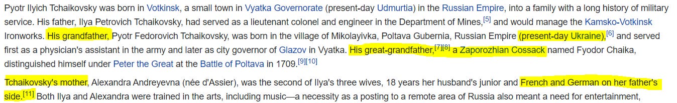 Whoops! Looks like Tchaikovsky actually had significant Ukrainian, Cossack, French and German ancestry!