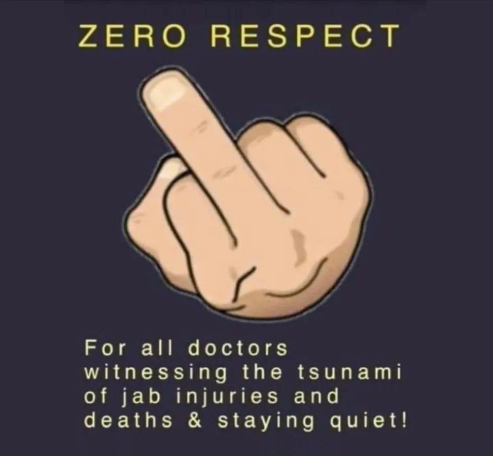 Love the "Zero Respect" one. So true. The whores of the pharma cartel are all they are. Now they are finding out what pimps do to their ho's LMAO. They've had more shots than anyone else and all I can say to the "medical Mengeles" is "RIP true believer. RIP"