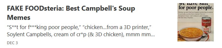 Campbell’s Soup = “S**t for f***king poor people” made with “chicken…from a 3D printer…:”