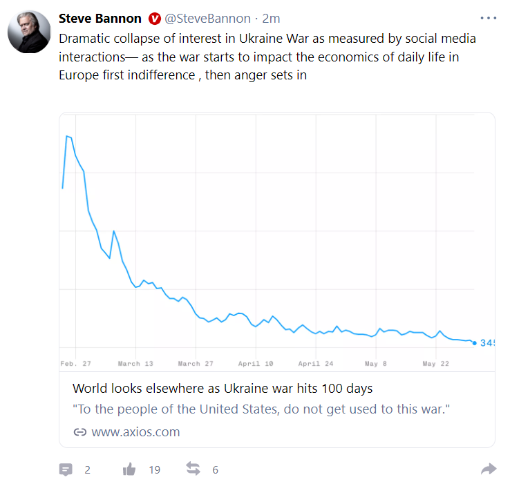 Steve Bannon on GETTR (https://gettr.com/post/p1cho9pebcb) - World looks elsewhere as Ukraine war hits 100 days: