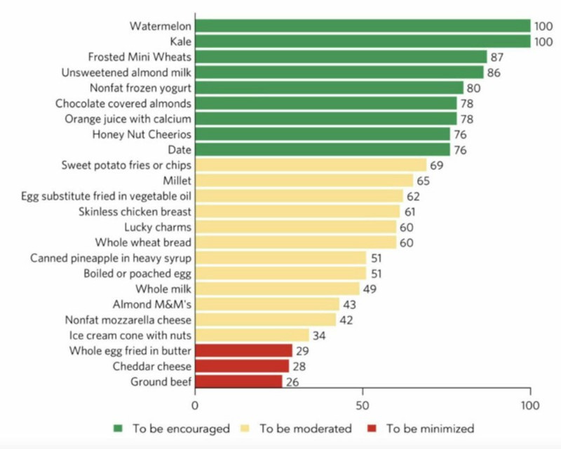 Soak in the idiocy: per the rankings, Honey Nut Cheerios© is a healthy alternative to a boiled egg. Almond M&Ms© is a superior nutritional choice to ground beef.