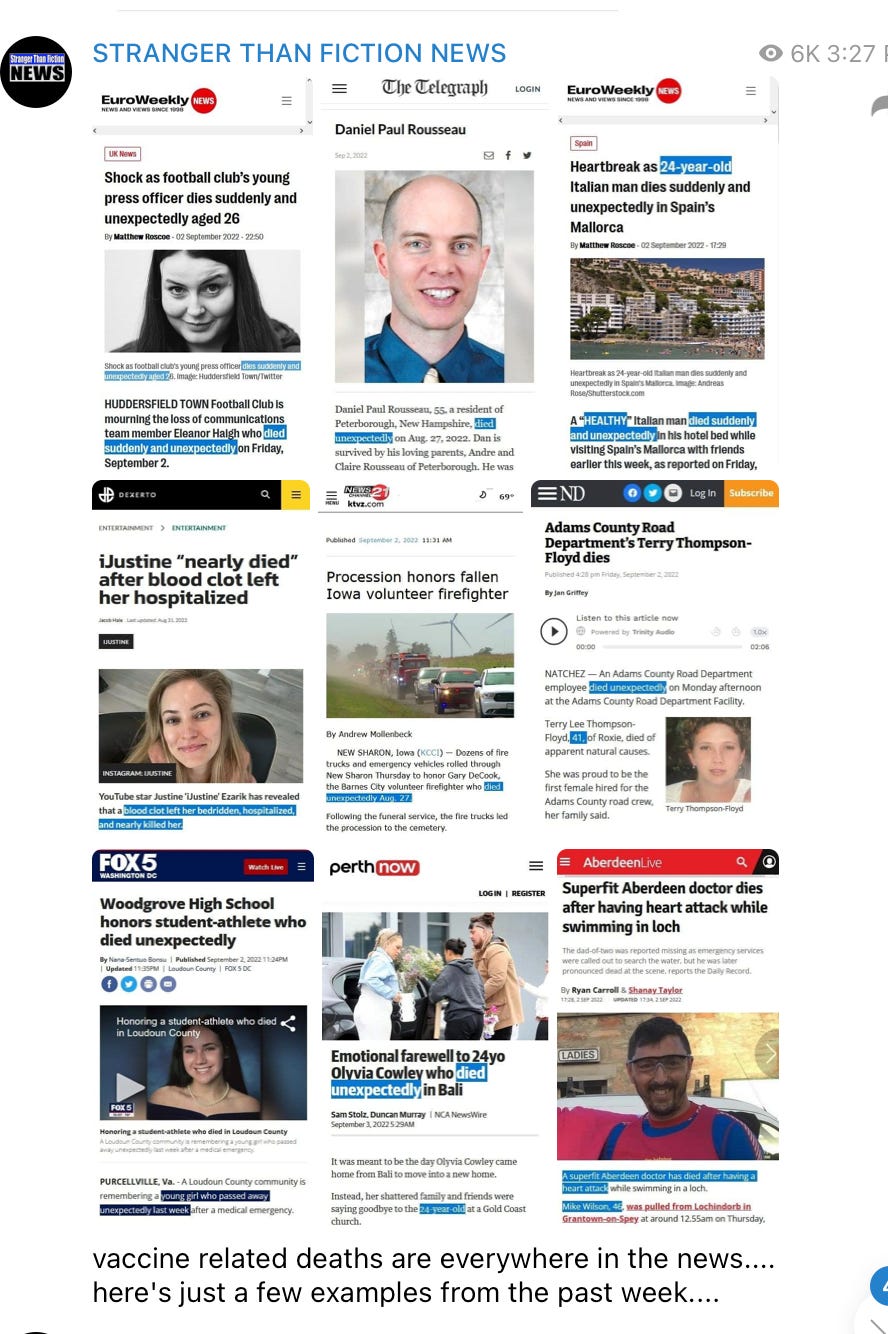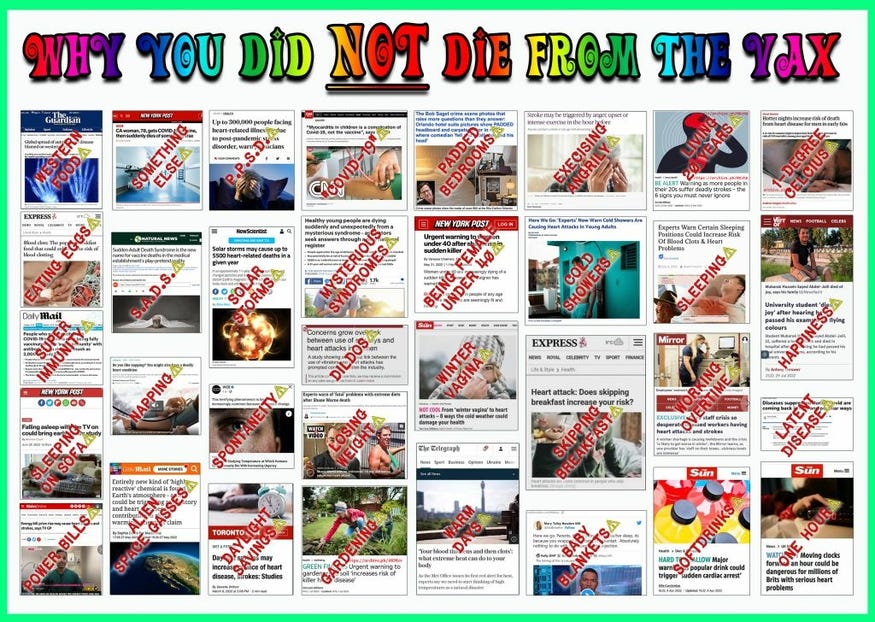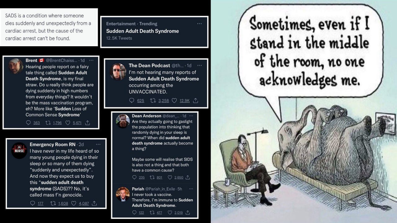 “Died suddenly and unexpectedly,” Sudden Invented Syndrome, I’m starting to see some patterns, anything but the elephant that keeps appearing and more vaccine side effects memes!