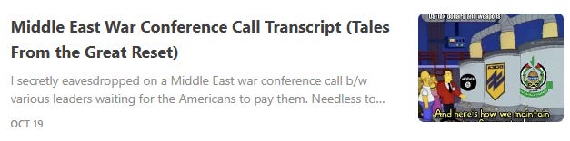 COVIDsteria: An Oral History of America’s Great Reset (Table of Contents) is a fictional satire along the lines of a Studs Terkel oral history or Max Brooks' World War Z published as a serialized book on Substack while Tales From the Great Reset is our occasional satirical short-story series and BREAD&CIRCUSES posts are weekly humor roundups. In addition, check out our Community + Links to Alternative COVID & Great Reset Resources...