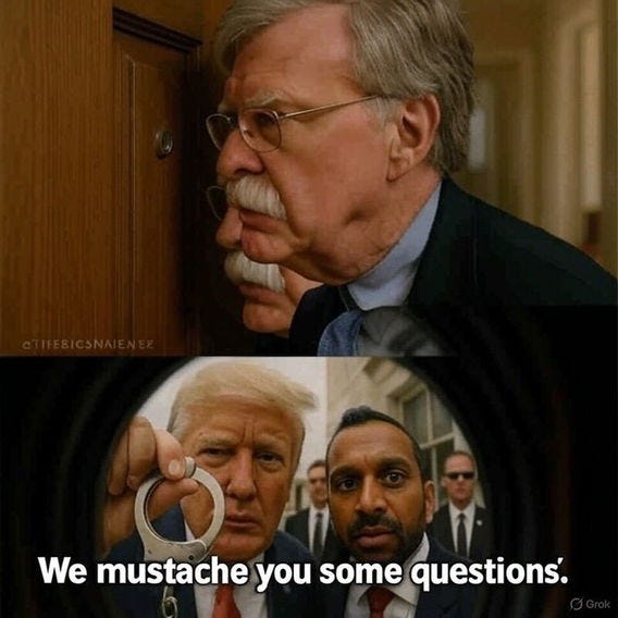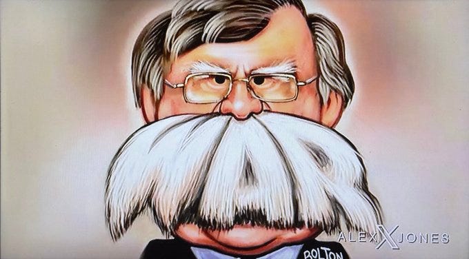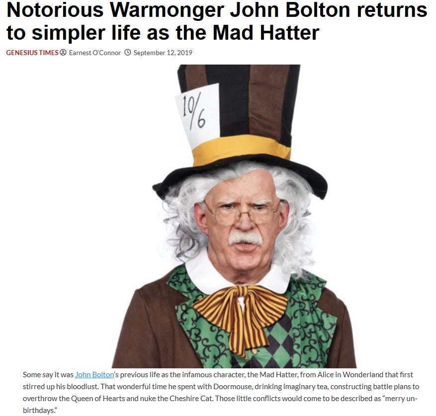 The terrifying nightmare of world peace & no death, the real Mad Hatter, obligatory mustache jokes, why they probably didn't search the wife's underwear drawl and more war pig John Bolton memes!