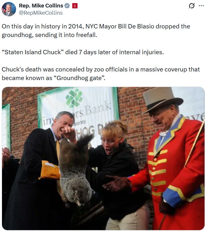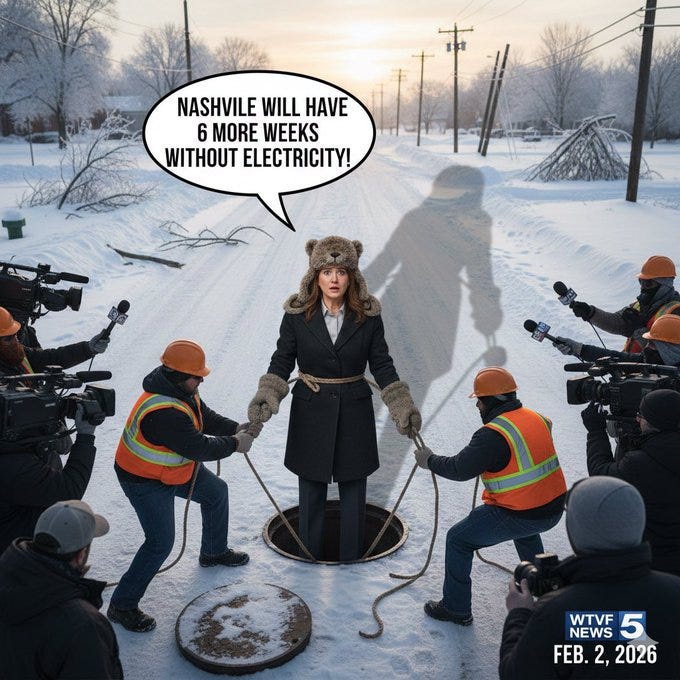 Democrat run Nashville (6 more weeks w/o electricity), Punxsutawney Trump, when Mayor Bill De Blasio dropped & killed the Staten Island groundhog and more snowcrete & Groundhog Day memes!
