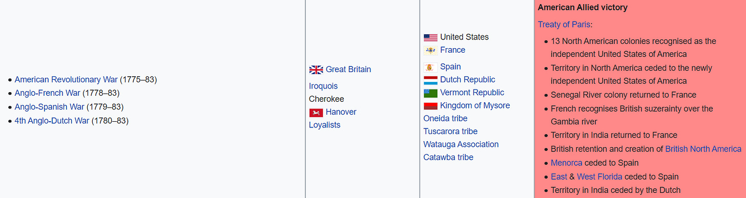The American Revolution? We seem to forget some details of just how many countries the British were fighting at the same time. The Brits and their empire came out of those wars in relatively good shape - minus their 13 colonies: