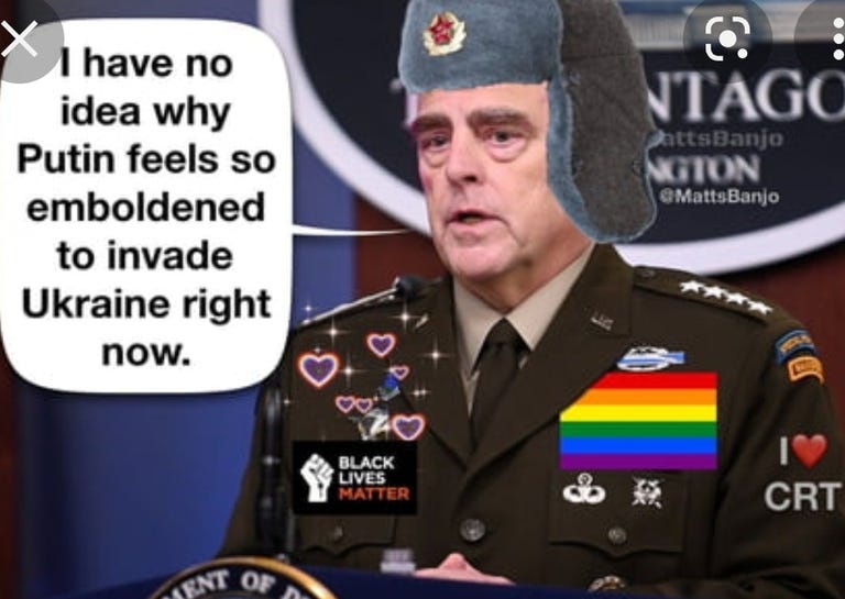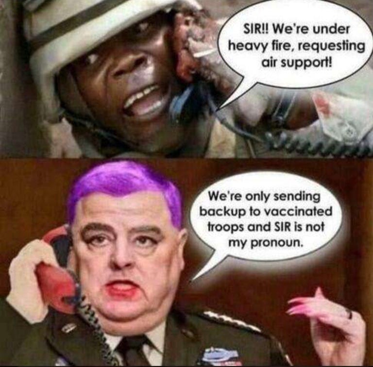 And until we start to turn back inward to fix and rebuild what is left of our country and civilization at home, we can still laugh at this clown General Milley and his increasingly woke FULL PURPLE DILDO military: