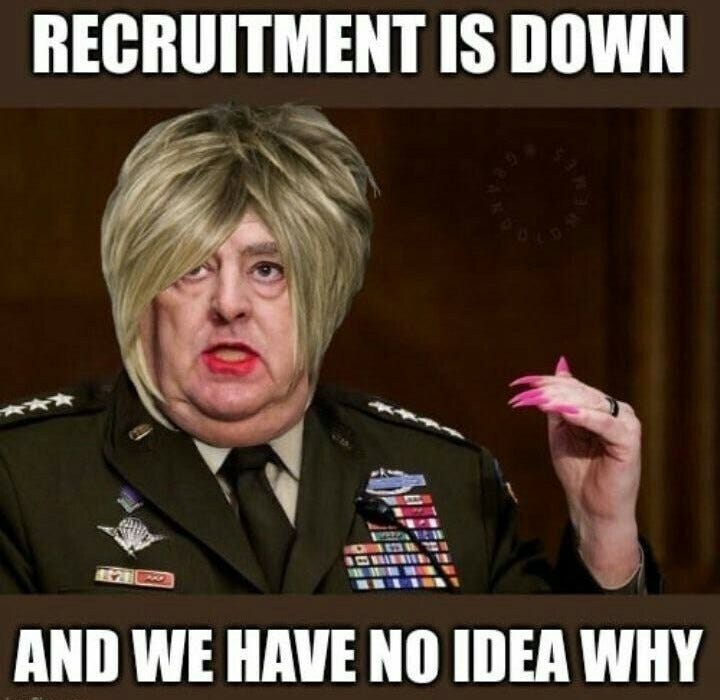 And the usual working class and poor cannon fodder types are no longer interested in lining up to become cannon folder for a full purple dildo military where they might have to give their lives (or a limb) to fight endless wars for the liberal world order…