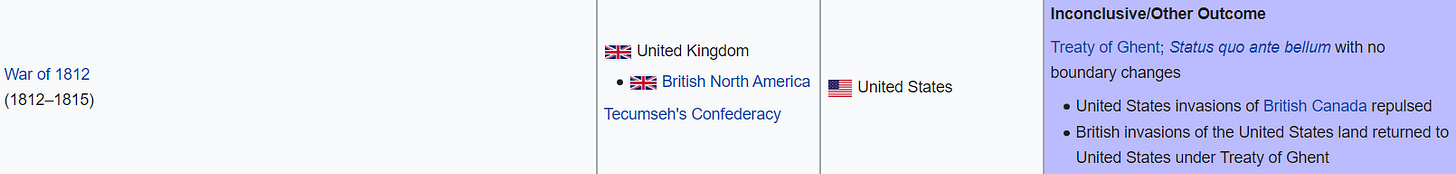 War of 1812? The British had been fighting the French and its allies since the 1790s and were in no position militarily or logistically to reconquer their former American Colonies while our invasion of Canada failed…