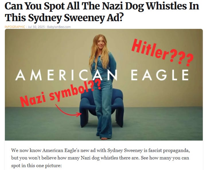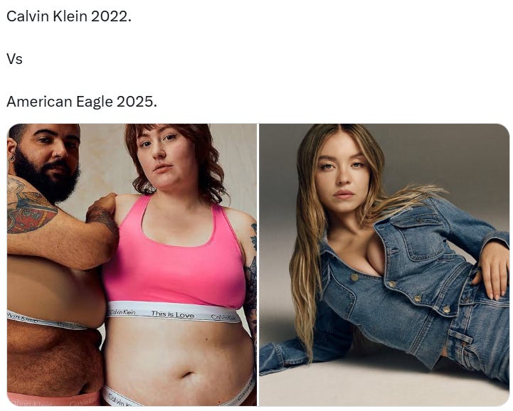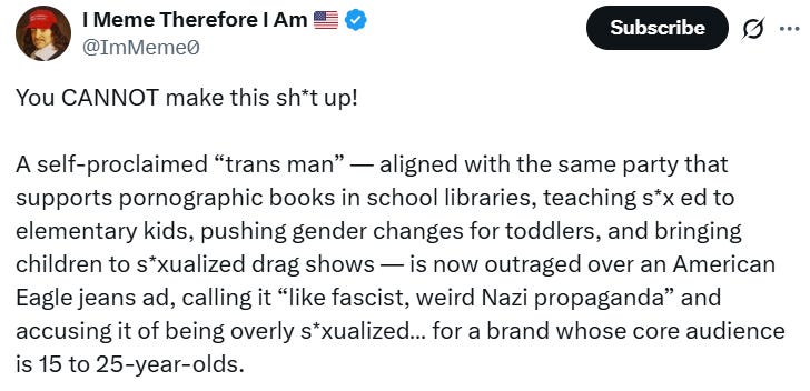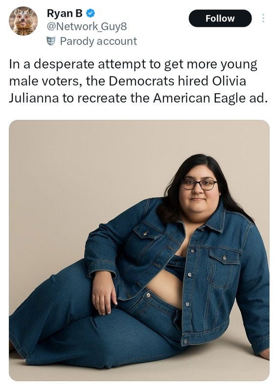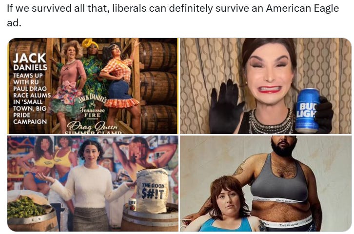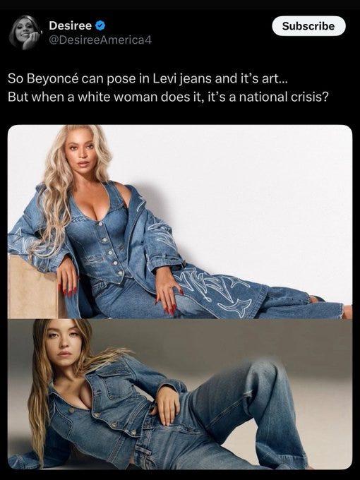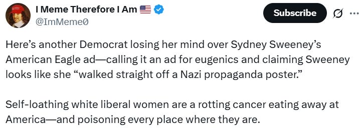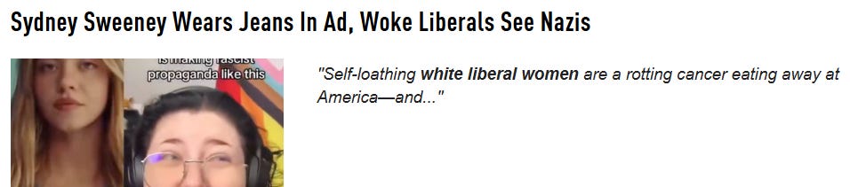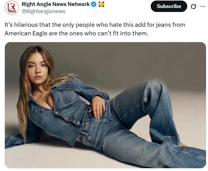 Naturally, woke liberals and especially liberal white women who can’t fit into Sydney Sweeney’s jeans as they are very upset:
