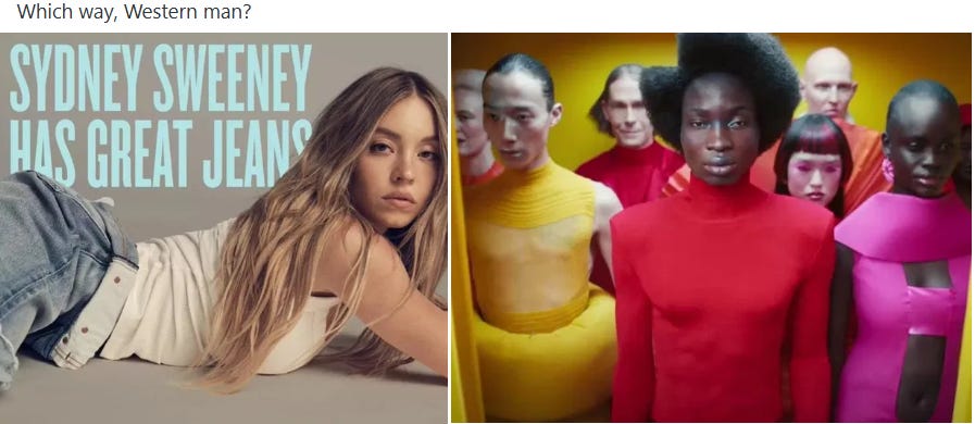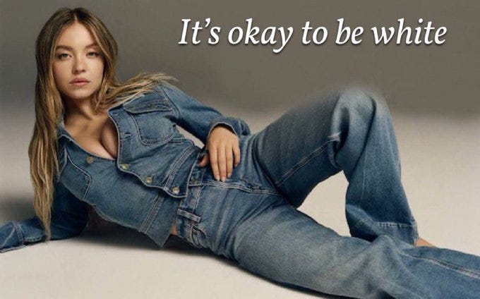 White jeans matter, definitely a fascist for loving this, which way western man, let's hope the era of fat women in lingerie ads is OVER and more American Eagle's Sydney Sweeney has great jeans memes!