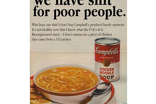 “S**t for f***king poor people,” “chicken…from a 3D printer,” Soylent Campbells, cream of cr*p (& 3D chicken), mmm mmm GMO, the substance, Progresso…